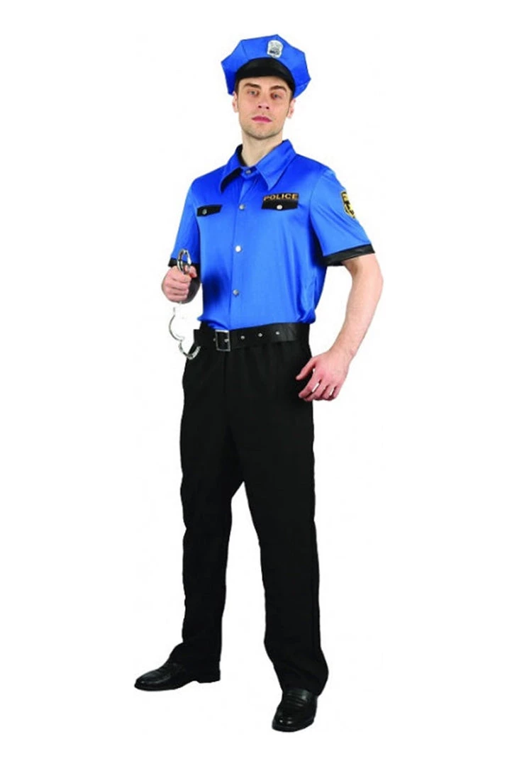 Includes short sleeved blue collared shirt with police badges, matching blue hat, black belt and black pants.