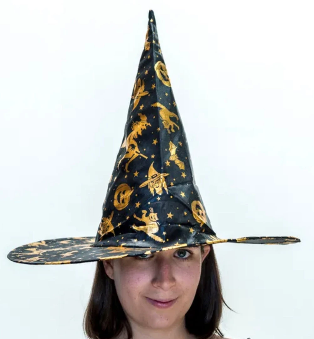 Bewitch the unsuspecting this Halloween with this black and gold witch hat.
