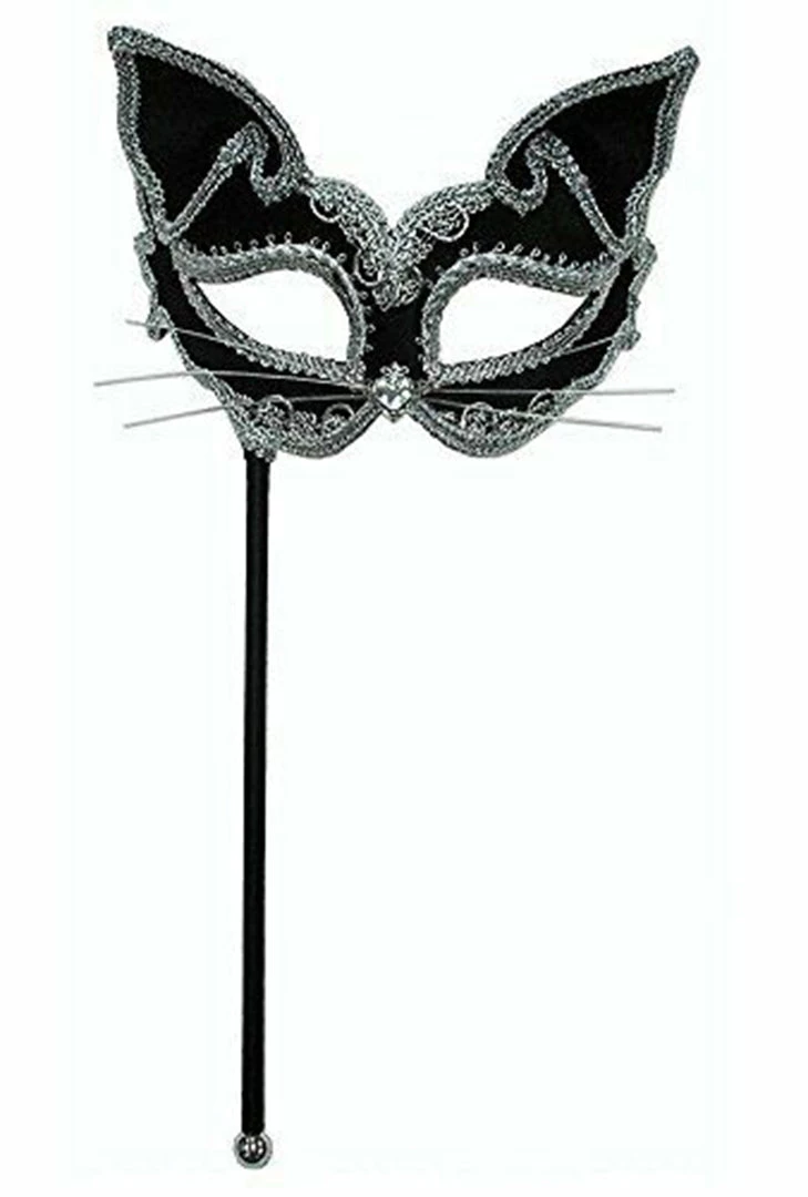 This kitty cat hand held silver and black masquerade mask accessory is perfect to conceal your identity when you attend your next fancy dress masquerade party. Masquerade mask features a cat face shape with cat ears and a diamante heart nose with plastic wire whiskers.