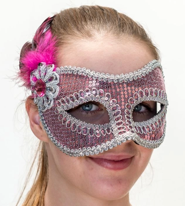 With pink gem detailing, silver bordering embroidery and a pink feather, this pink sequin masquerade mask is a stunning and classic piece to wear to your next masquerade ball!