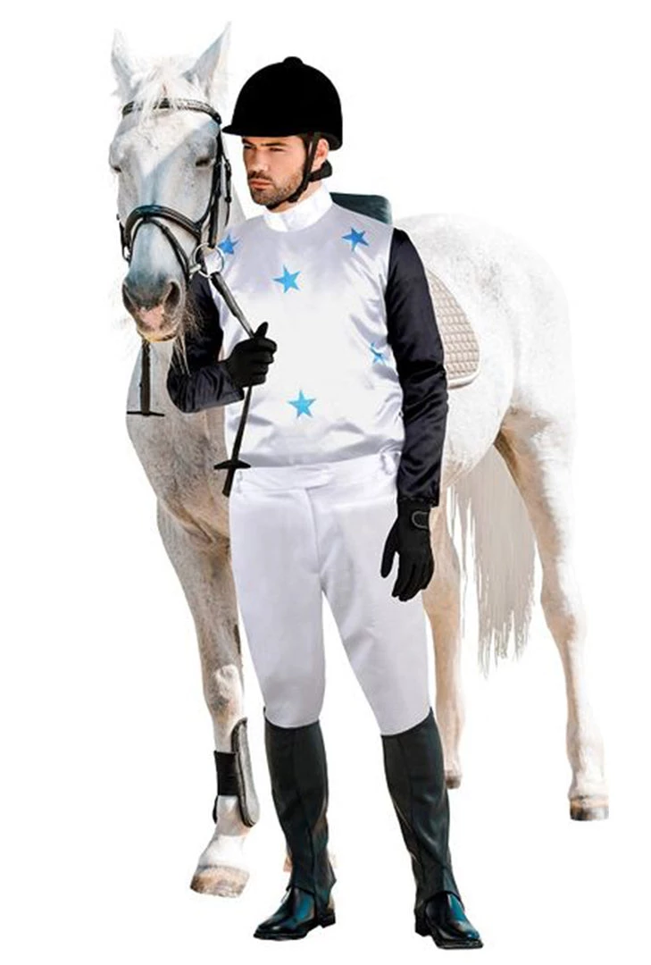 The White Jockey Costume includes White Pants with Pockets & a White Shirt with Star Details. Perfect for Melbourne Cup! Mens Size L.