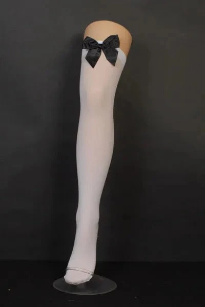 White sheer thigh highs with black bows at the top. Perfect for school girl or Oktoberfest dress ups.
