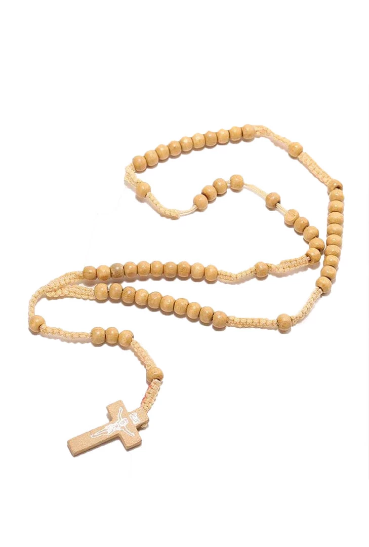 This Cream Beaded Crucifix Necklace has a wooden cross pendant with metallic silver Jesus graphic. Necklace features a Rosary bead pattern with woven cords.