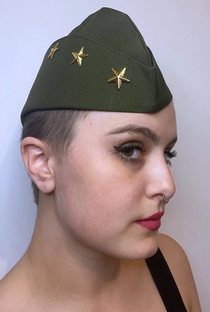 The Khaki Green and Gold Stars Side Cap has 3 Metal Gold Stars on the side of the hat. Perfect for Sailor, Pilot and Military Costumes!