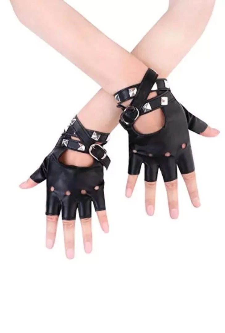 Black fingerless PU gloves with buckle strap and silver stud detailing