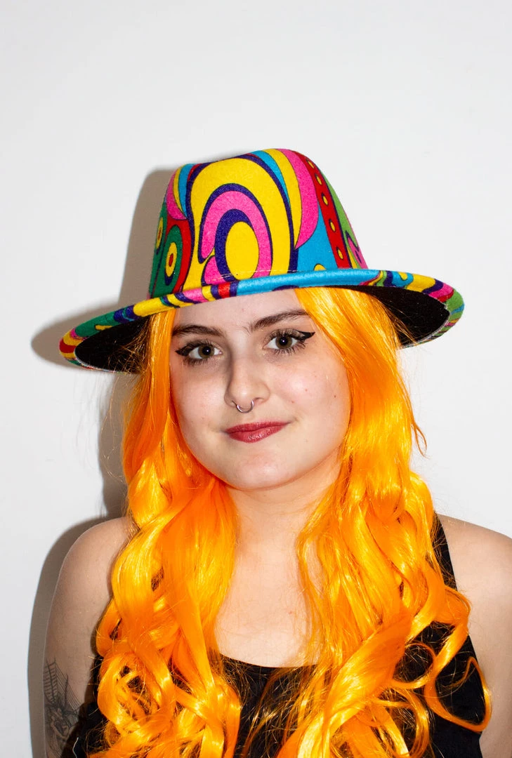 Our Super Psychedelic Rainbow Print Hat is in a Fedora stye hat with a wide brim and top pinch. Perfect for your 70s Hippie Disco Party! One size fits most.