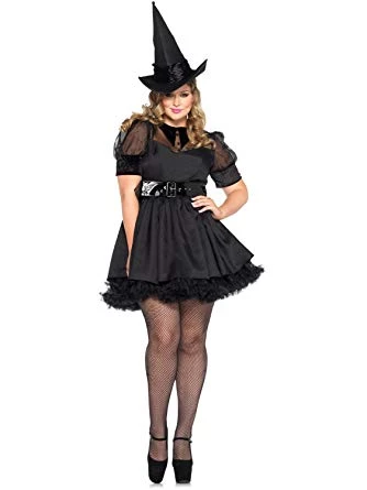Short black witch dress featuring circle style skirt, sheer chest pannel and puffy sleeves, black velure collar, matching hat and belt.