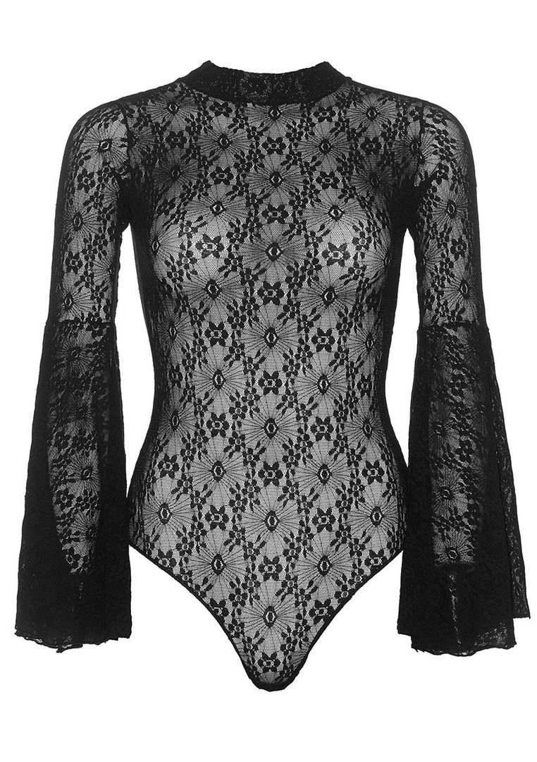 Stunning black lace bodysuit with soft bell sleeves and high neck.