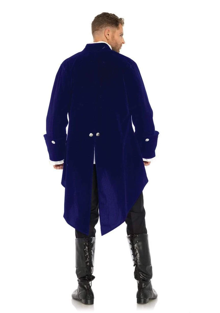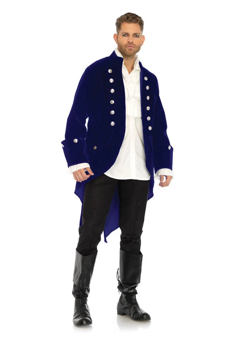 This deluxe Leg Avenue Mens Long Velvet Military Coat with Wide Cuffs and Coin Buttons in Blue features cuffed sleeves and an open front. Perfect for a different style of steampunk outfit or a Beauty and the Beast costume!