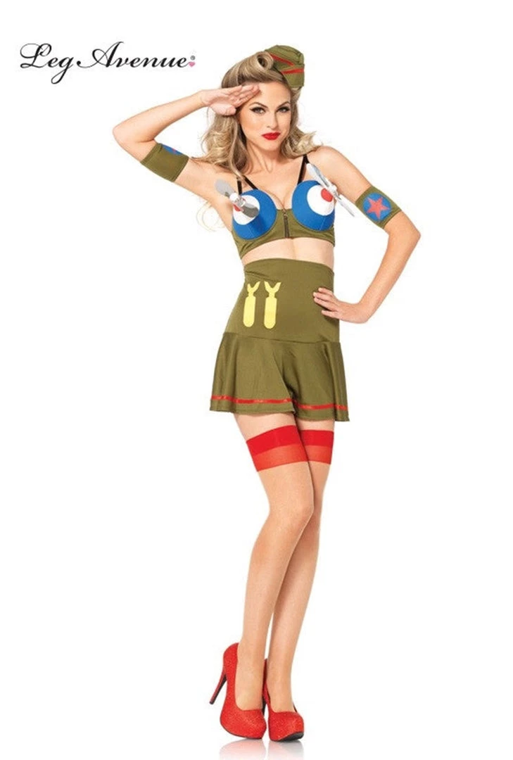 Dive in and make a real impact at your next party with the bomber plane inspired costume. Includes the propeller bra, skirt, arm cuffs and hat.