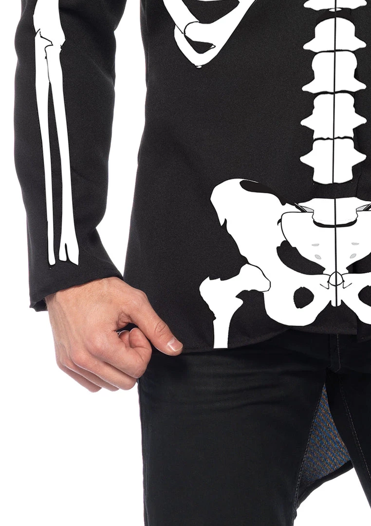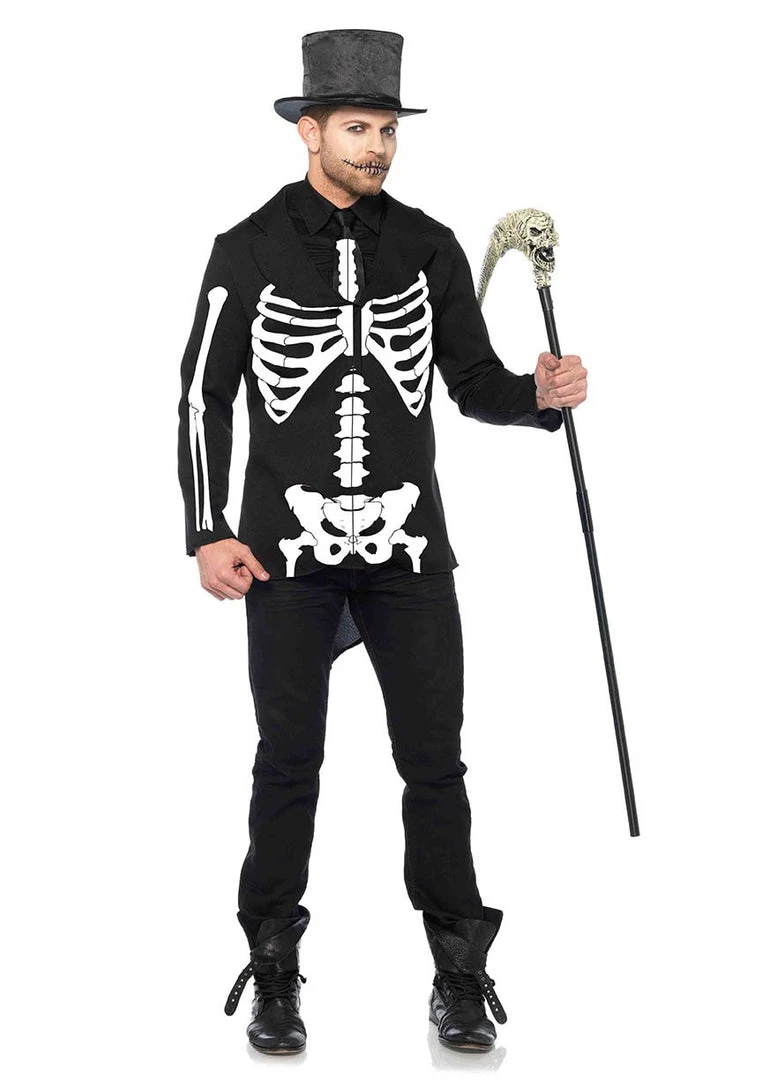 Includes long jacket with skeleton printing on the back and front and skeleton print neck tie.
