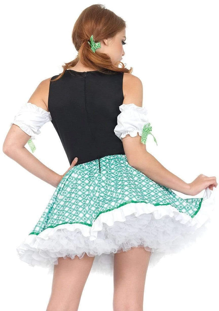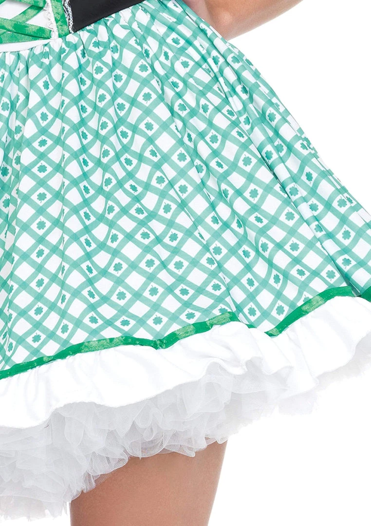 Get lucky this St Patrick’s Day with the 2 PC. Clover O’Cutie leprechaun costume by Leg Avenue. This green cutie features a clover print peasant dress with attached puff sleeves and matching clover hair bows. (Petticoat not included)