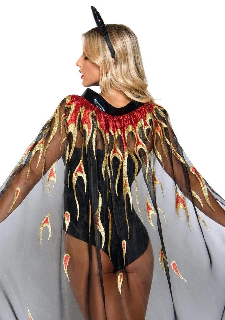 This versatile set includes horns headband and a sheer glitter flames cloak. Ribbon tie front for easy wear, one size fits all!