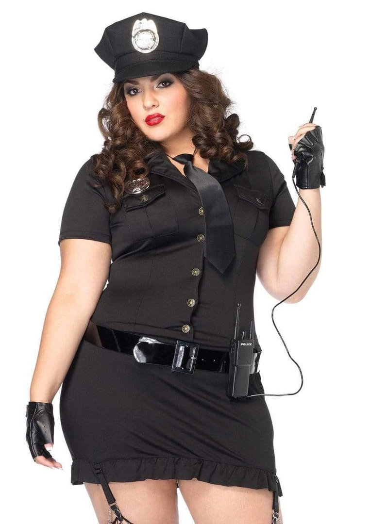 Play by your own rules in the 6 PC Dirty Cop plus size women’s Halloween costume by Leg Avenue. This sexy plus size Halloween costume comes complete with a button front dress with handcuff garters, fingerless gloves, belt, tie, toy walkie talkie, and police hat. Complete your look with Leg Avenue stockings, sold separately.