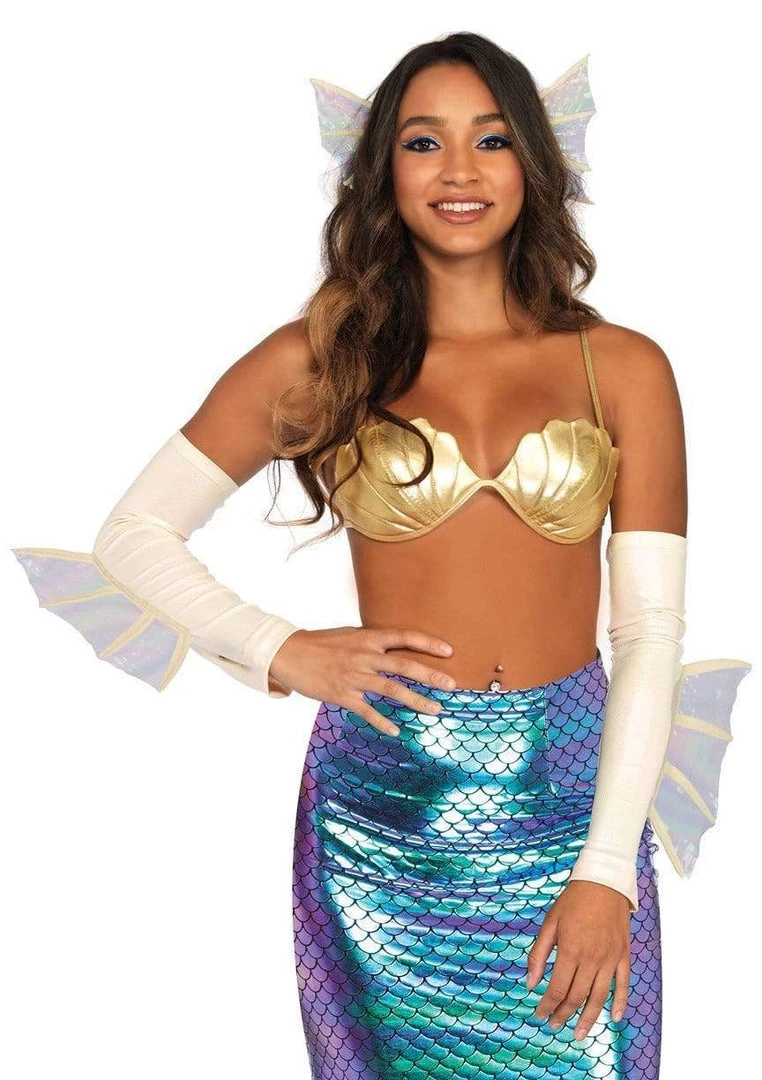 Includes headbands with fins and matching arm sleeves. The perfect accessories to complete your next Mermaid costume.