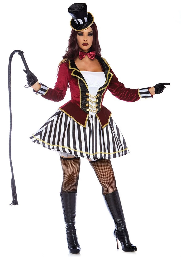 Command your audience in the show stopping 3 PC Night Ringmaster costume. Your center ring look includes a gold trimmed velvet tuxedo dress with sequin lapels and striped satin skirt, choker bow tie, and matching top hat.