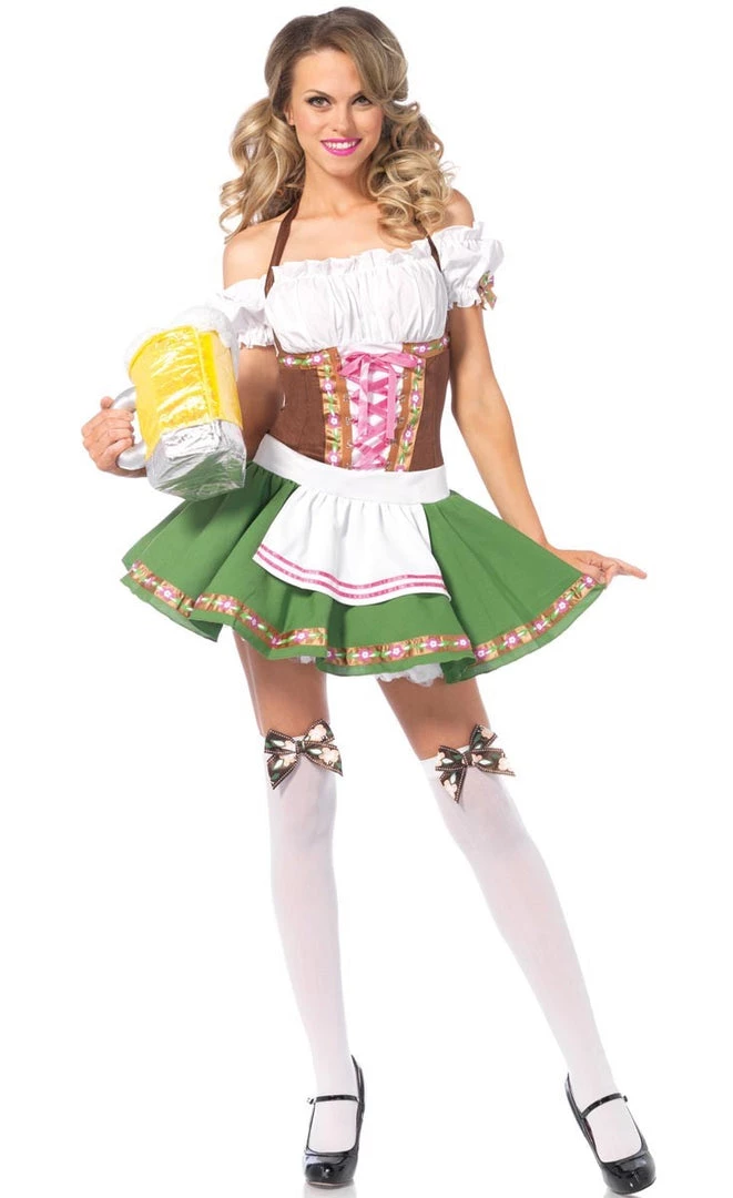 Beautiful comfortable Oktoberfest costume complete with attached apron and matching thigh high stockings. Ties at the neck for a halterneck look.