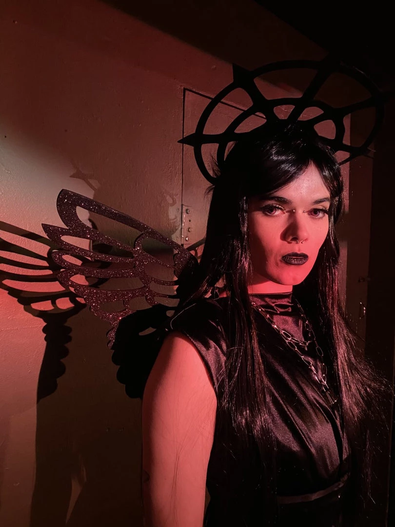 Die cut glitter black wings on elastic straps and matching headband.
