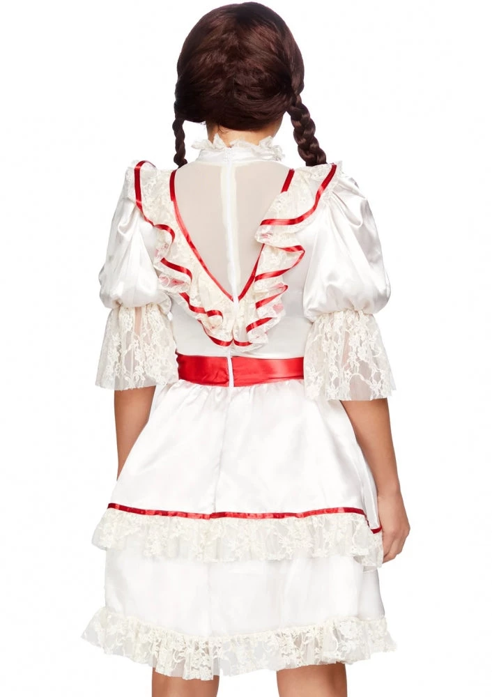 This scary costume by Leg Avenue features satin lace trimmed antique doll dress with attached bow sash.