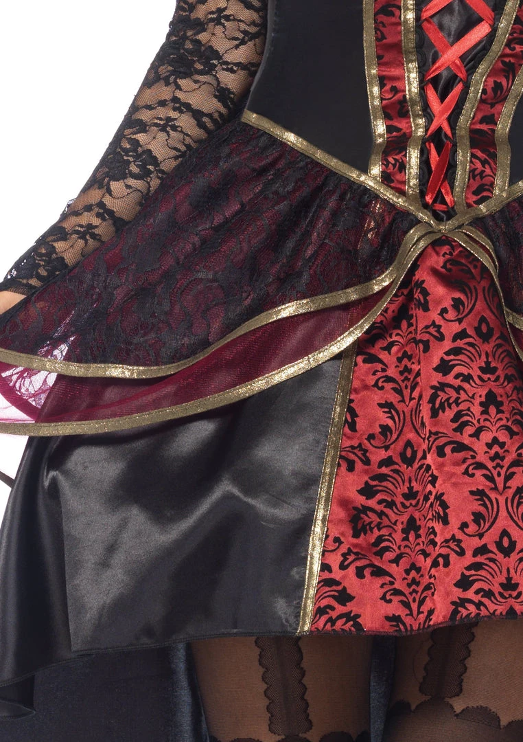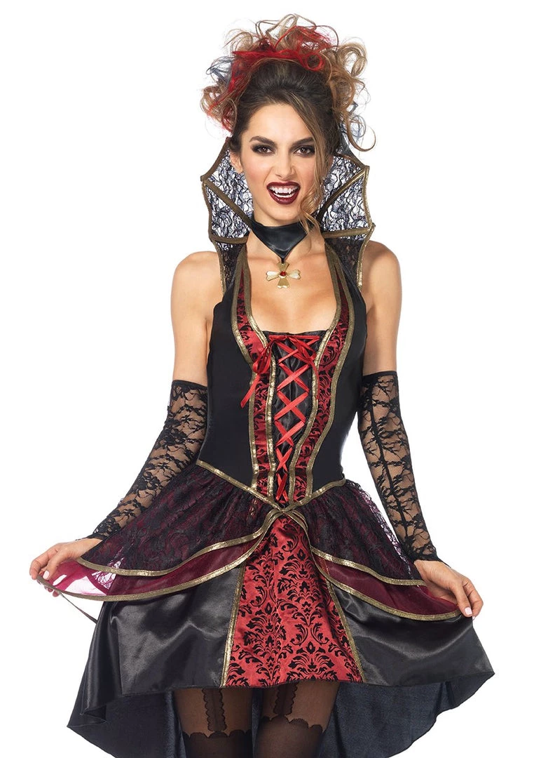 3 PC. Vampire Queen, includes high/low dress with brocade accents and stay up lace collar, lace gauntlet gloves, and cross choker.