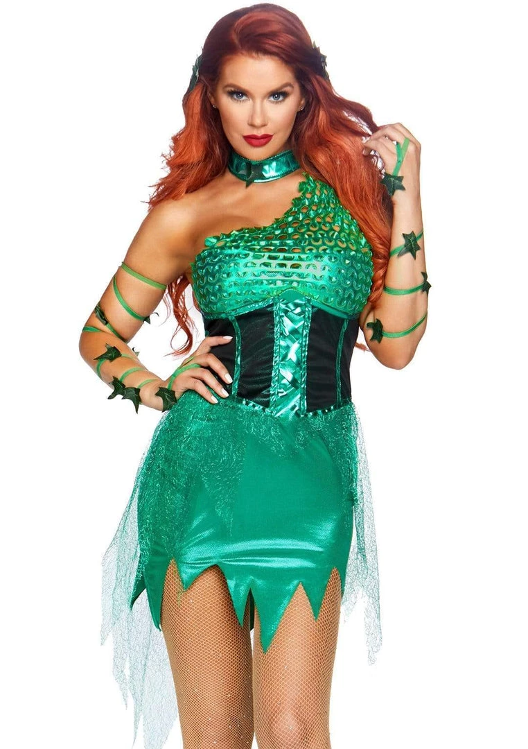 This stunning Poison Ivy costume from Leg Avenue includes a form fitting dress with waist cincher, ivy leaf arm wraps, and ivy hair clips. add a red wig to complete the look!
