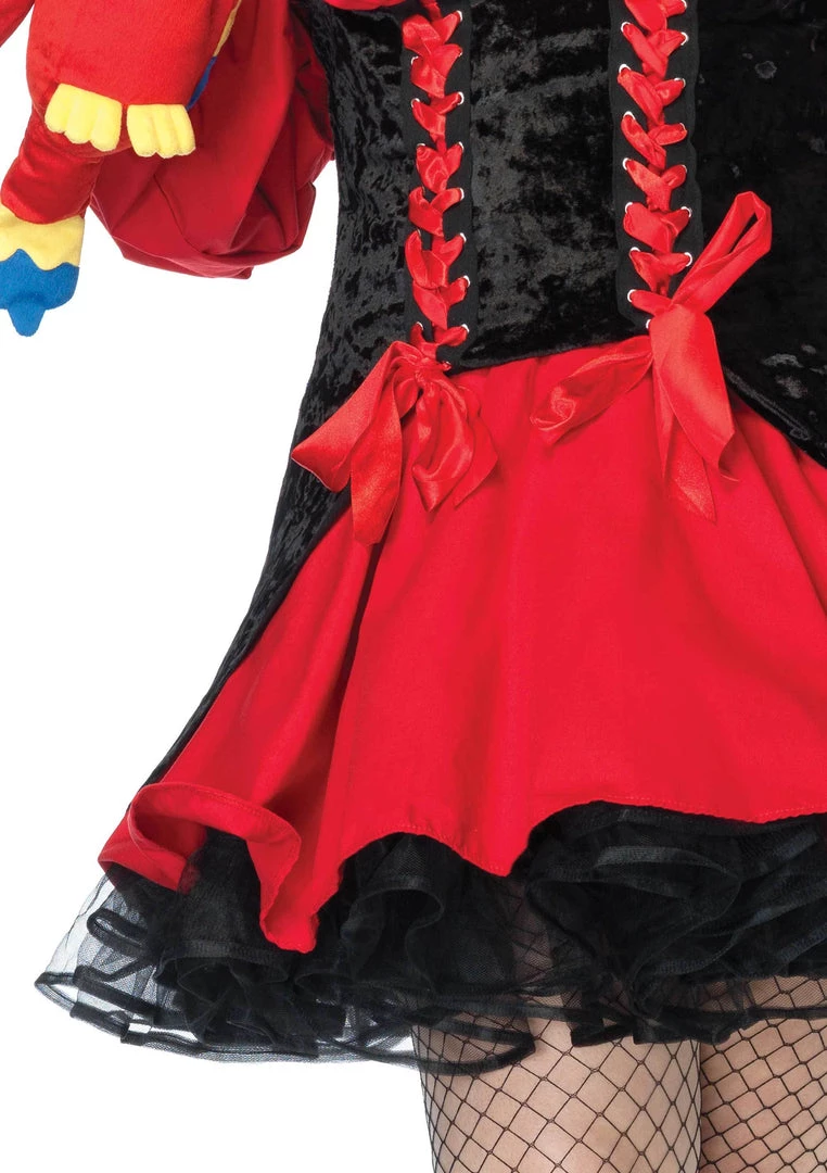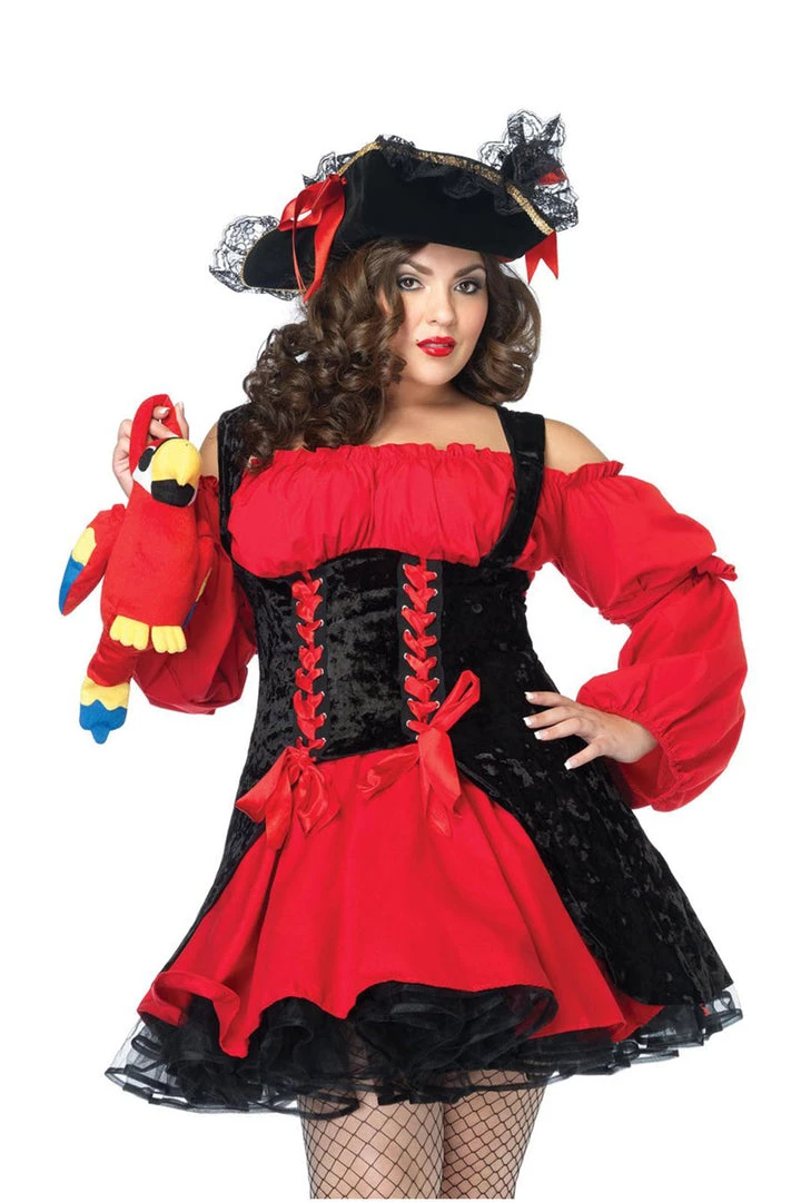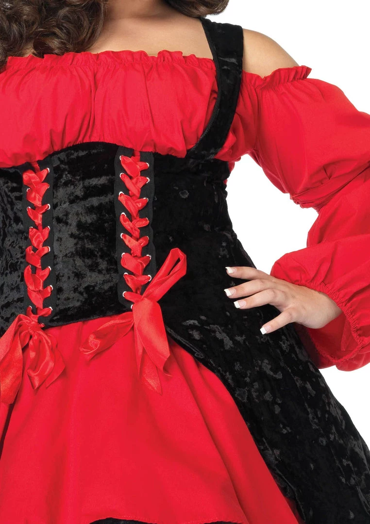 Black and red short pirate dress with velveteen body and red puffy off the shoulder sleeves, corset detailing up the front and zip closure at the back.