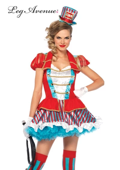 This Ravishing Ring Master costume includes classic circus coat dress with ruffle trimmed satin skirt and matching top hat. Fantastic for circus themed parties or for a fun Halloween costume.