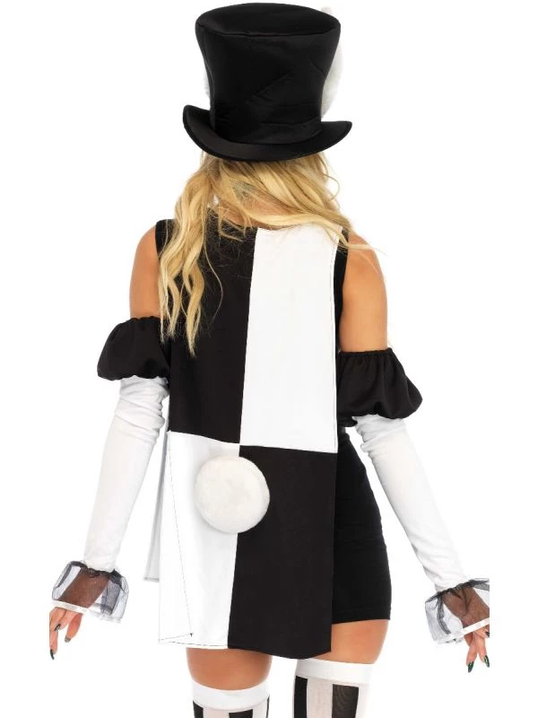 Costume Includes a Black glitter card suit dress with a tank dress liner, soft front and back panels, and fluffy bunny tail on back card. A White ruffle collar with black trim, Puff sleeves with ruffled cuffs and a Matching top hat with furry ears.