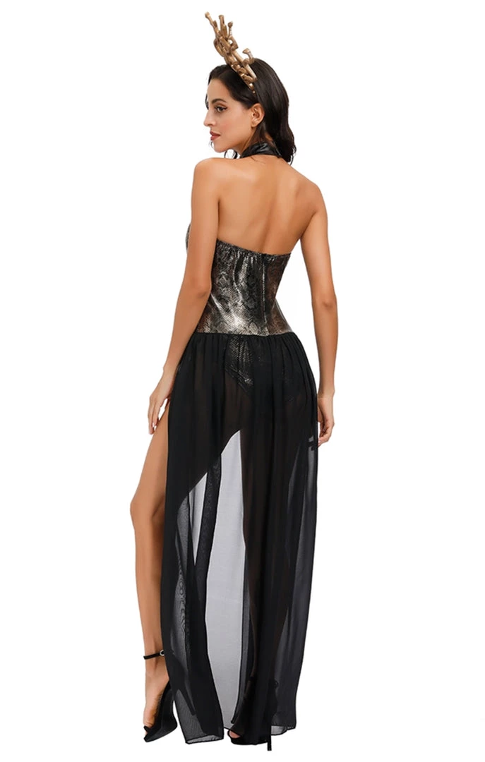 The Sexy Medusa Costume will make you look irresistible for Halloween! Costume includes a Halter Neck Wet-Look Gold Snake Print Cut-Out Bodysuit with an attached Long Black Chiffon Train Skirt and a Medusa Snakes Headband!