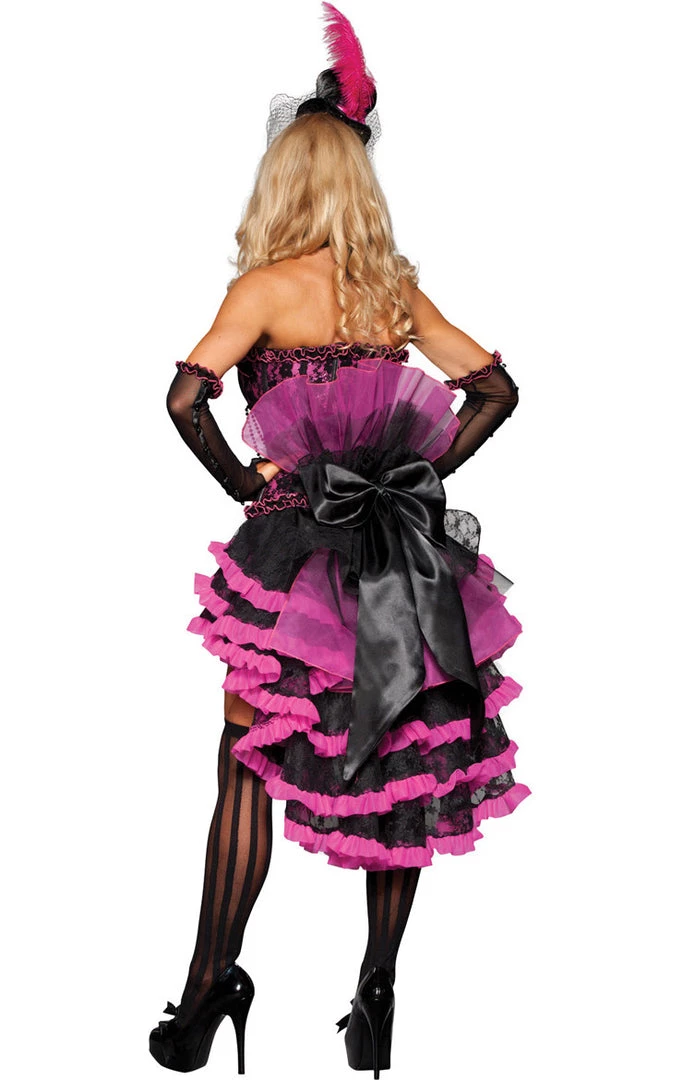 This is the easiest costume you’ll ever buy! A corset style top attached to a bustle(long in the back, short in the front) skirt.