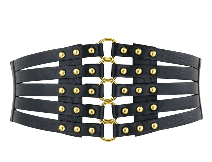 accessorize any outfit with this cincher belt to give you that perfect hourglass figure. Features a cage front with gold rivet and ring detailing on black snakeskin pleather and an elastic band with a press stud closure at the back.
