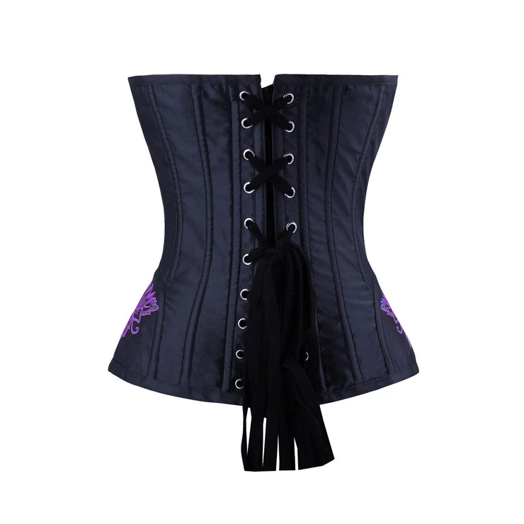 This beautiful black overbust corset has a stunning pink floral embroidery design featured on the front. It has a classic busk front-closure with a lace-up back closure.