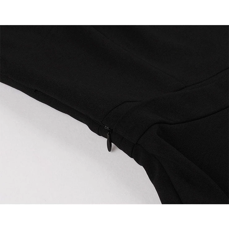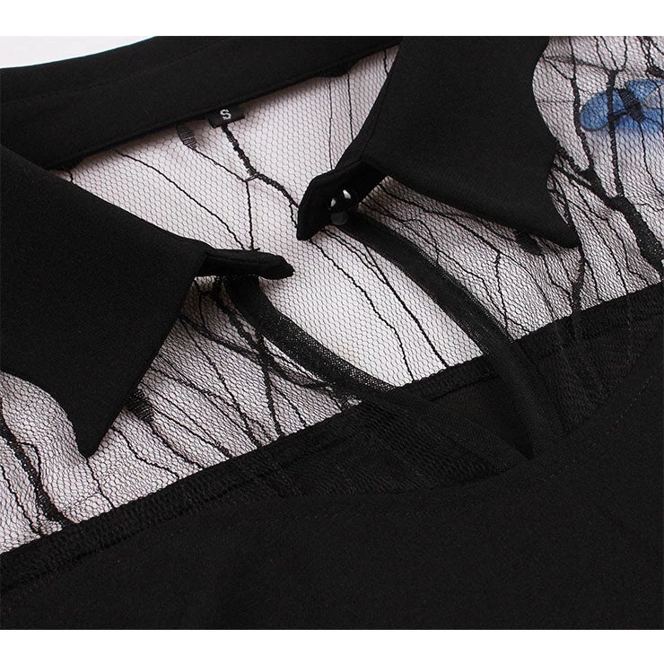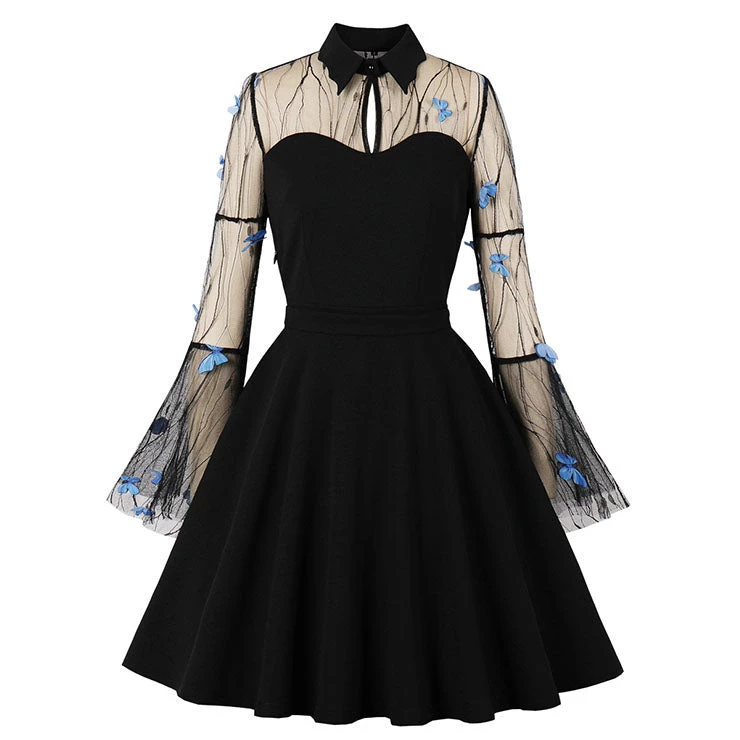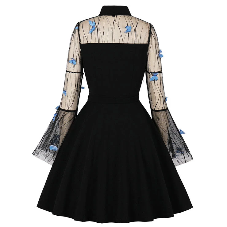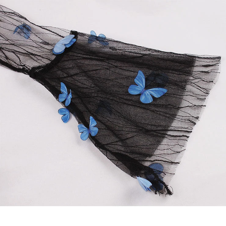 This gorgeous gothic skater dress features a button close collar, and long lace sleeves with flared cuffs. The lace sleeves and shoulders are decorated with small blue butterflys, bringing whimsical vibes to this classic dress.