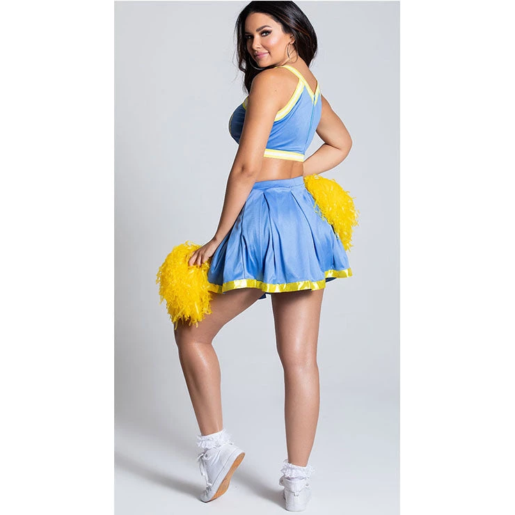 Bring it on with this cute light blue and yellow cheer squad costume! Including crop top, skirt, and yellow pom poms!