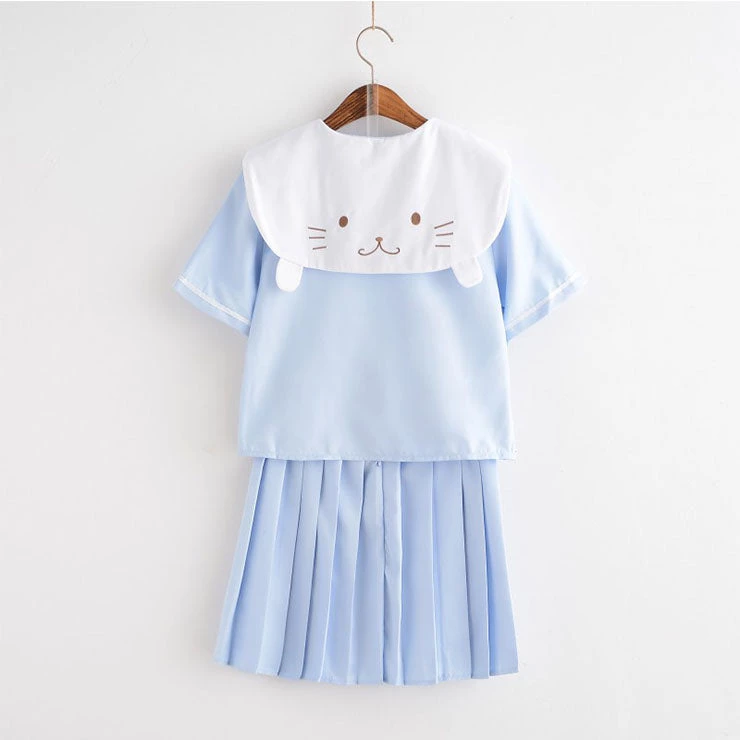 This Lovely School Girl Costume includes a Navy style baby blue blouse with blue short sleeves, a white navy collar with a cute seal face on the back with a dark blue bow and a matching blue mini pleated skirt. Perfect for cosplay, casual wear and other occasions.