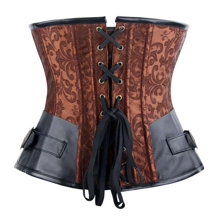The Brown Jacquard Steel-Boned Underbust Corset has a Busk Closure at the front and a Lace-up Back Closure. Underbust has a Leather Hip Detail. Great for a steampunk look or a pirate costume.