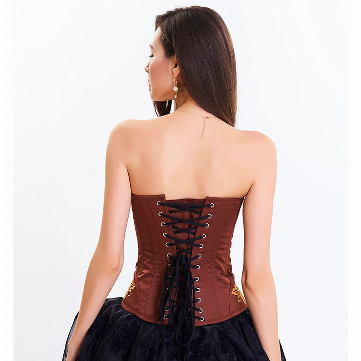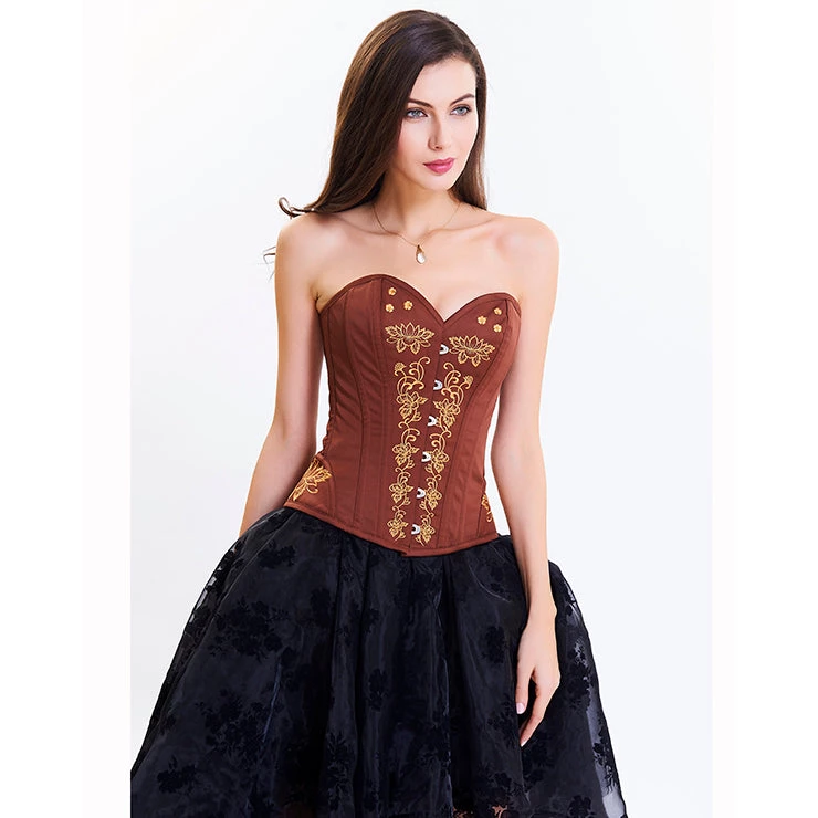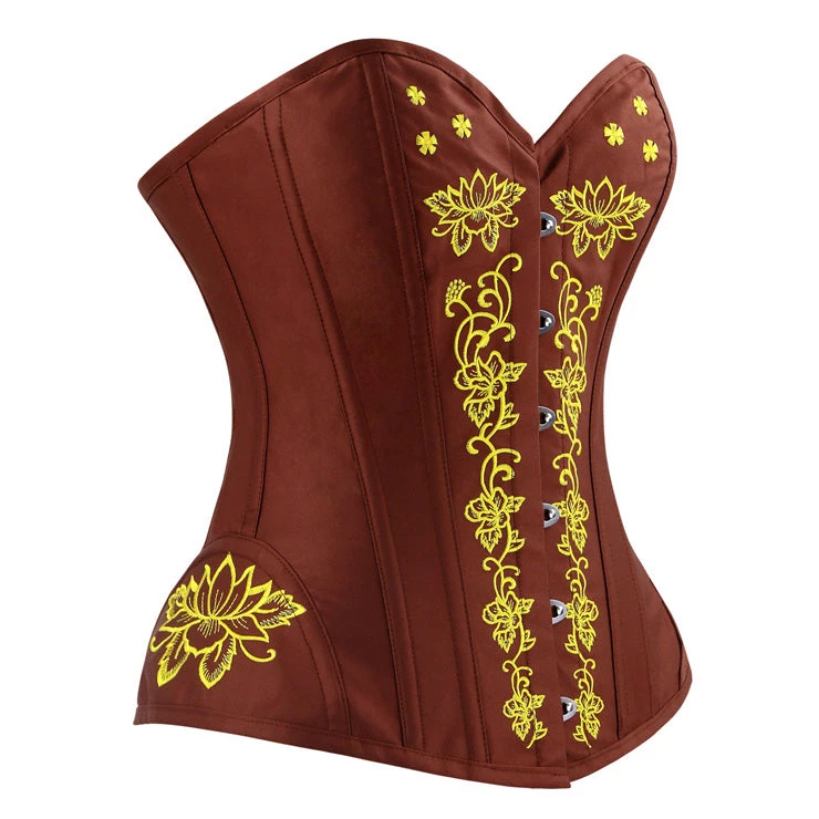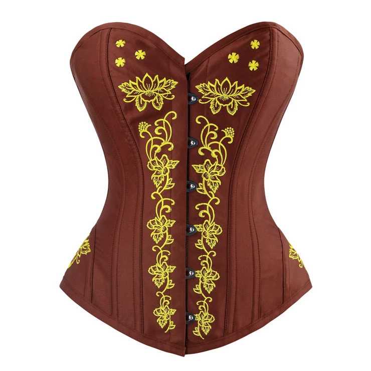 This beautiful brown overbust corset has stunning mustard floral embroidery featured on the front and on the hips. It has a classic busk closure on the front and a lace-up back closure.