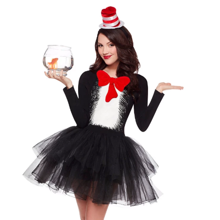 Perfect for Book Week, this adorable ladies Cat in the Hat Costume includes a Black Tulle Long Sleeve Dress with White Fluffy Chest Print, a Red bow and stripy mini top hat on a headband!