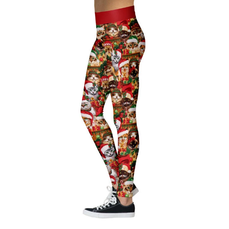 Stretchy digital printed Christmas leggings with cute catsin festive hats.