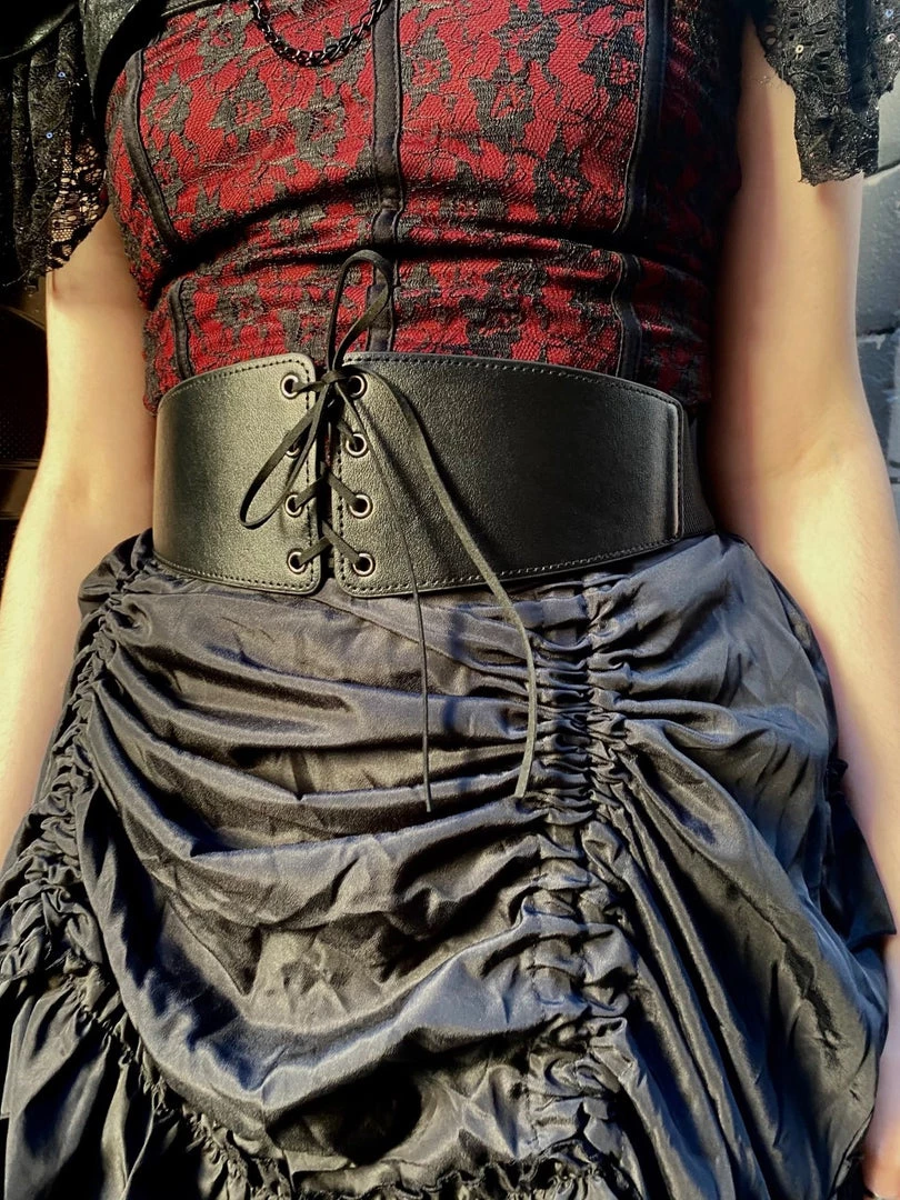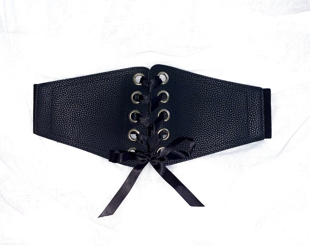 Accessorize any outfit with this cincher belt to give you that perfect hourglass figure. Features ribboned corset style lacing at the front with textured leather detail and a stretchy elastic band with a 3 press stud closure at the back.