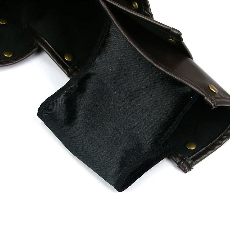 Our Brown shoulder and arm holster is made out of high quality faux leather with rivets at surface, one-shoulder design, a strap with adjustable eyelet over the bust for cinching, three buckles fix in the medial arm.