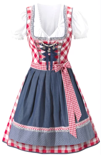 This 3 piece Oktoberfest dress features a seperate cropped white puffy sleeved top, checked red and white dress with double lined bust and embroidery and seperate apron that ties around the waist.