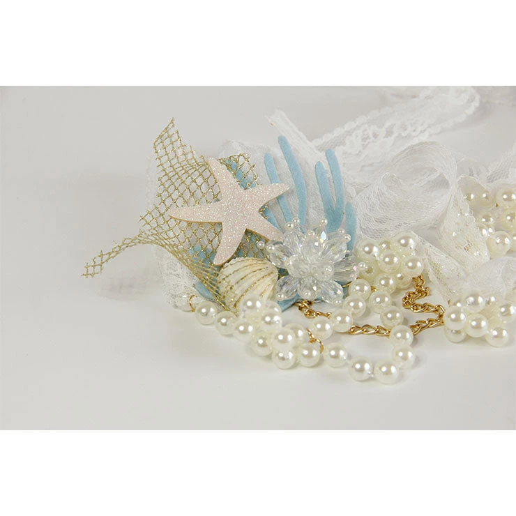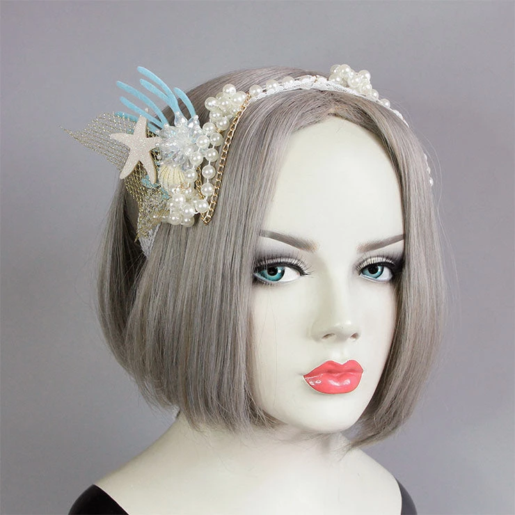 Perfect addition to your classy mermaid costume, this stunning headband features glitter shell, starfish and coral, white pearl detailing and gold netting with chain