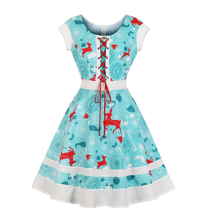 Cute cap sleeve dress in a festive reindeer print in light blue, red and white with white trim. Features lace-up front bodice, high waisted swing skirt, and concealed back zip.