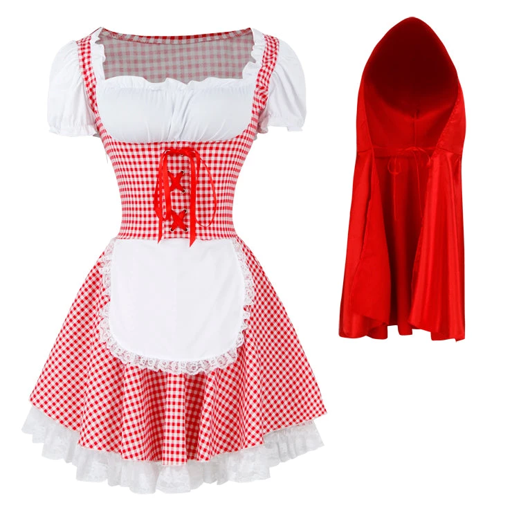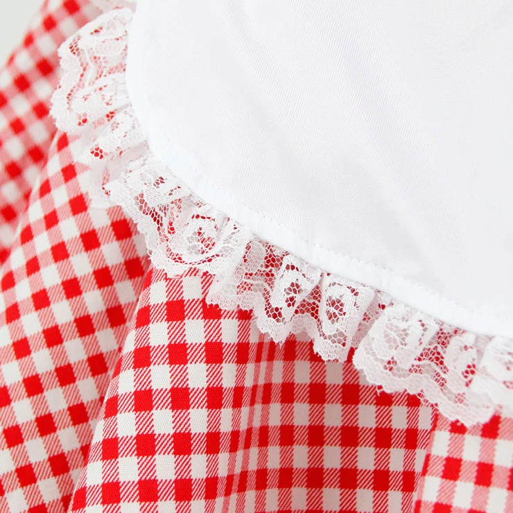 Red and White checked dress with attached white apron, red satin hooded cape, zip closure on the side and attached white tulle underskirt.