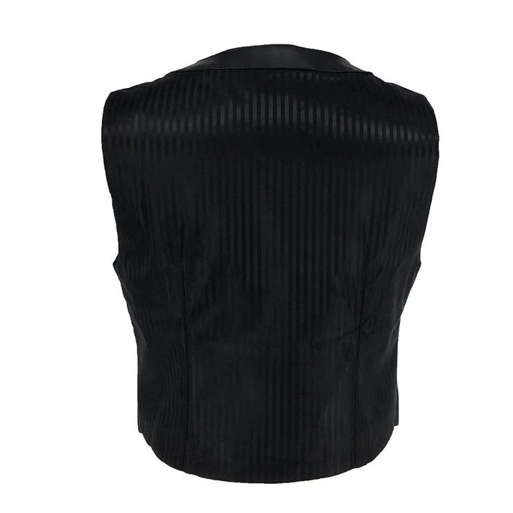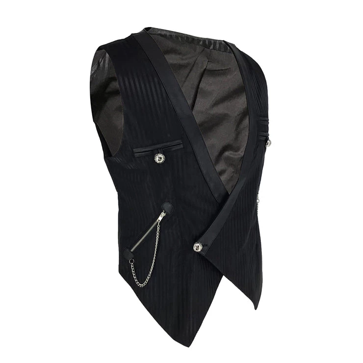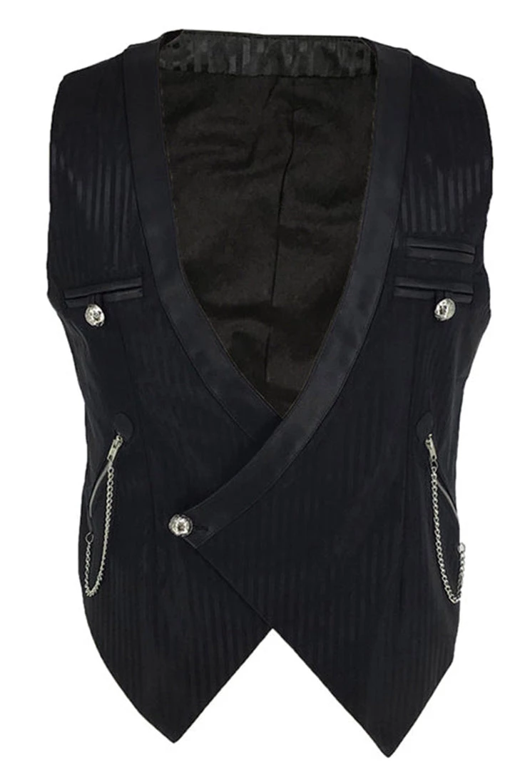 This stylish gothic black V-neck pinstriped steampunk waistcoat vest comes with with ornate silver button and chain detail. Perfect for taking your Dracula cosplay or steampunk outfit to the next level.