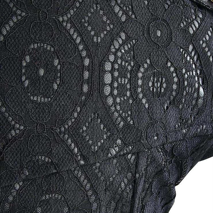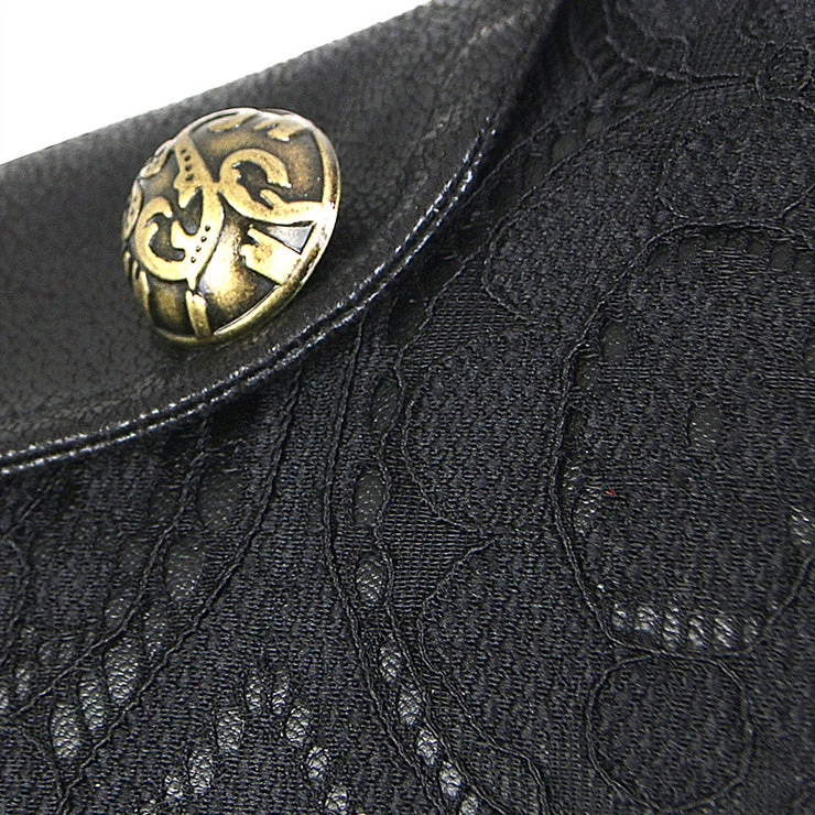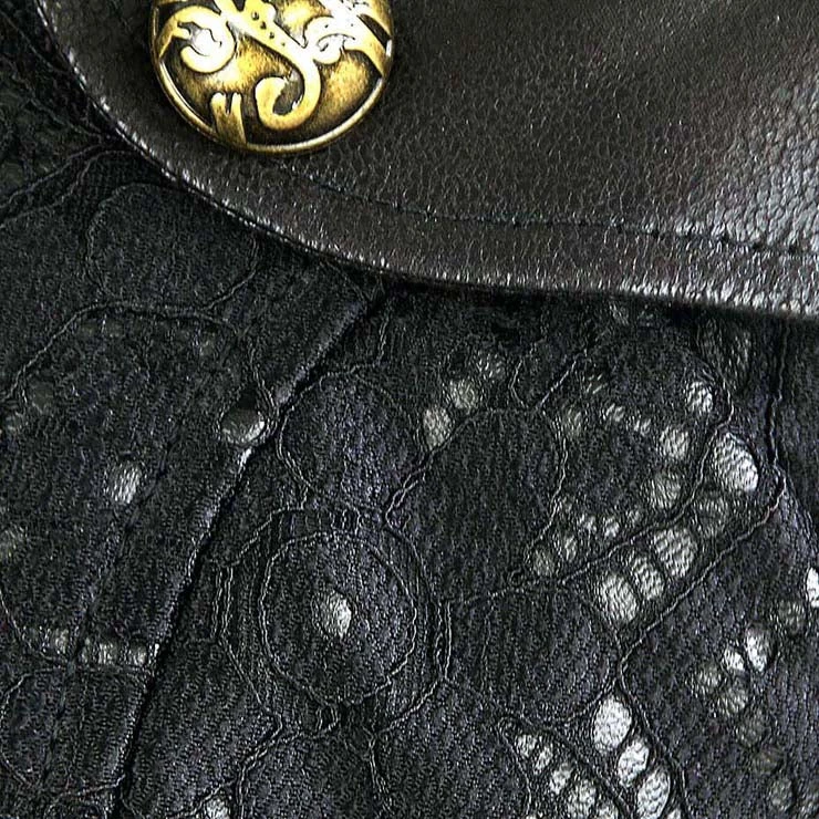 Black steampunk cropped jacket with leather look trim, adjustable buckle closure at the chest, bronze button detailing and black lace style overlay.