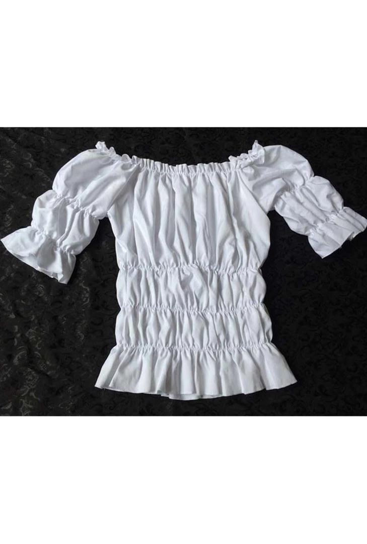 This white top can be worn off the shoulder or on the shoulder. Works great under an underbust or overbust corset for a very traditional steampunk (or even pirate) look.