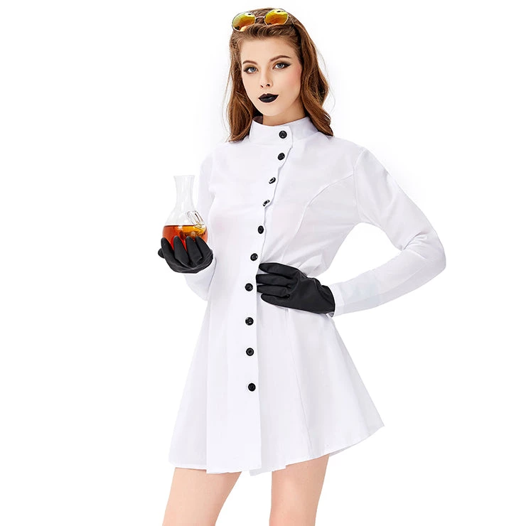 This Sexy Scientist Costume includes a high neck mini length white robe with long sleeves, matching black gloves and glasses. Handheld experimental bottle is not included. Small.