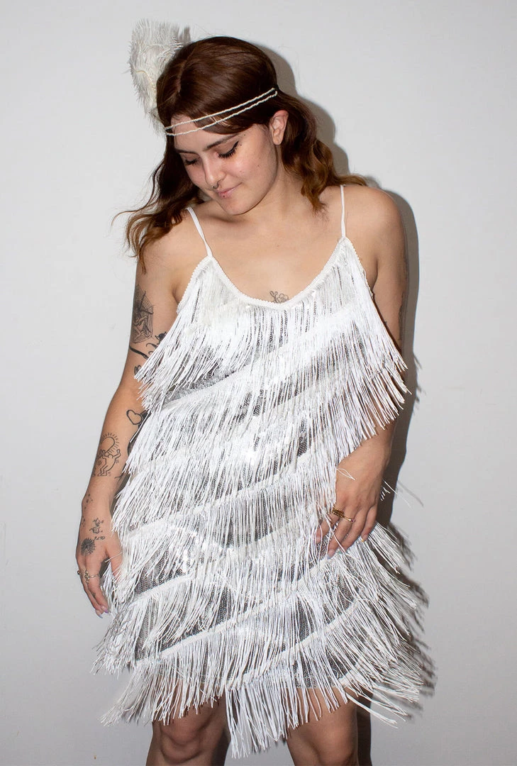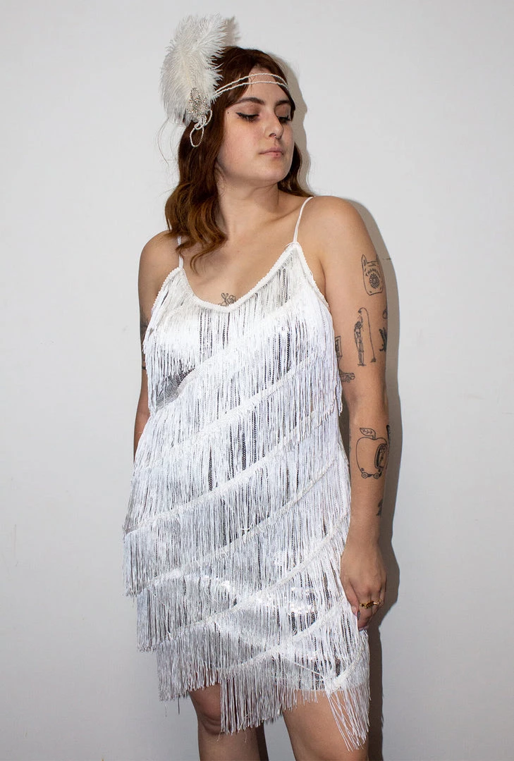 Get your party on with this fun fringed sequin flapper style dress. Inspired by classic 1920s flapper dresses, this white number is perfect for your Roaring 20s and Great Gatsby parties. Featuring adjustable straps for more personalised fit.